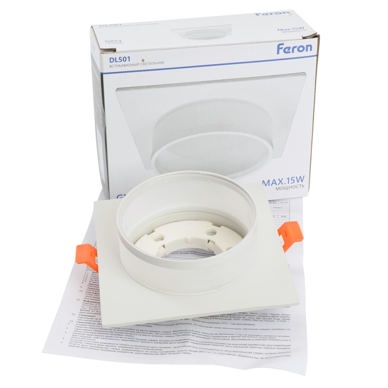 Характеристики Светильник встраиваемый Feron DL501 потолочный GX53 белый квадрат