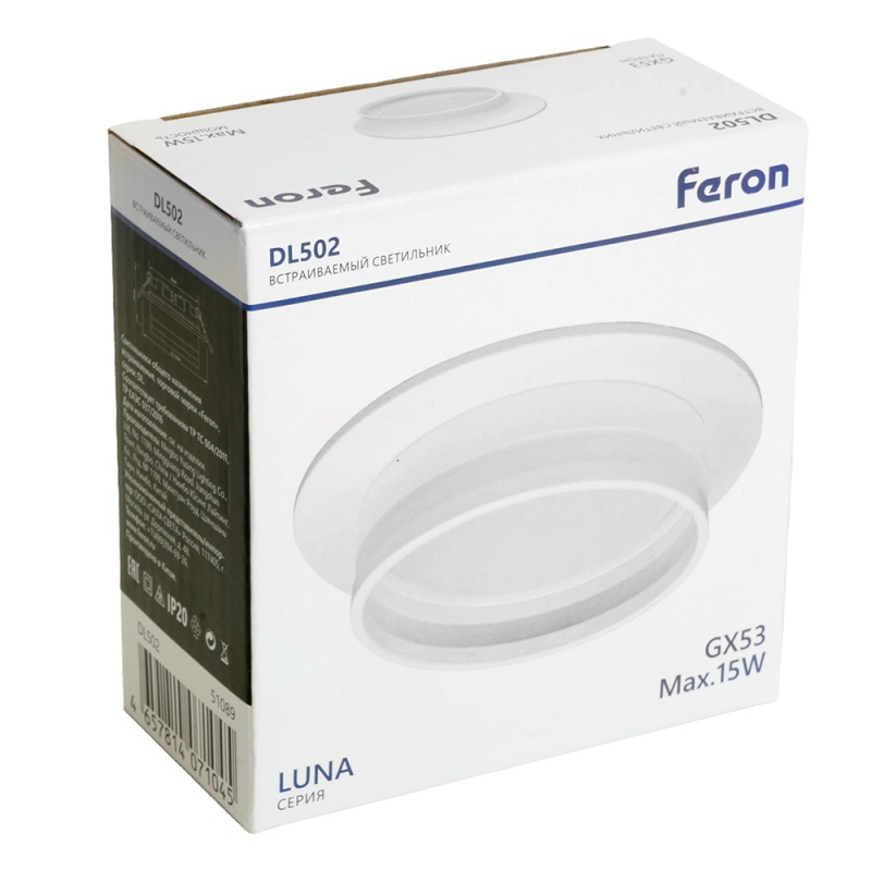 Характеристики Светильник встраиваемый Feron DL502 LUNA потолочный GX53 белый круг