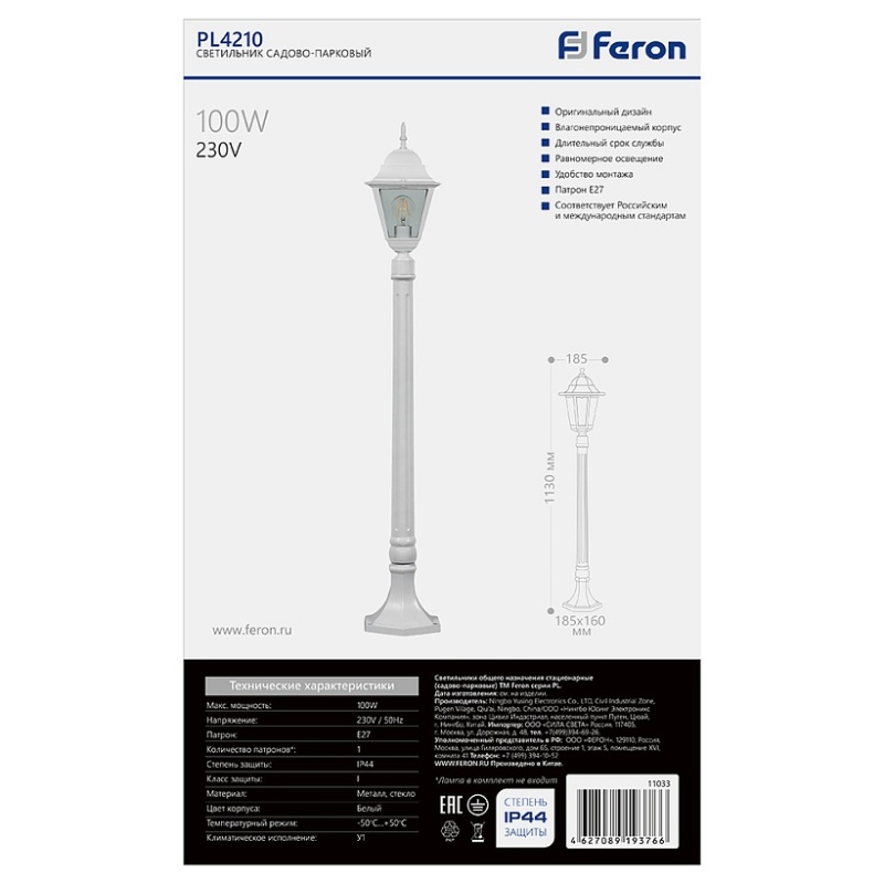 Светильник садово-парковый Feron 8110/PL8110 столб 100W E27 230V, белый