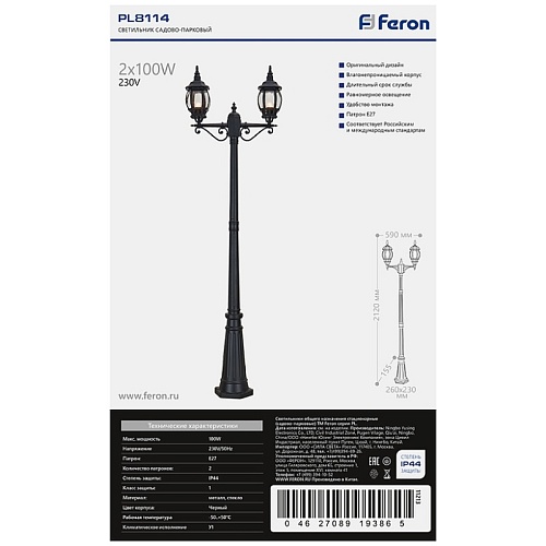 Светильник садово-парковый Feron 8114/PL8114 столб 2*100W E27 230V, черный