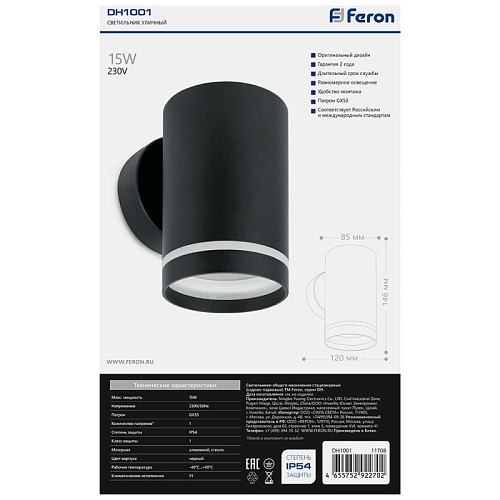 Характеристики Светильник садово-парковый Feron DH1001, на стену, GX53, 230V, черный