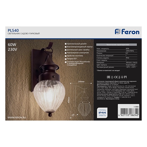 Характеристики Светильник садово-парковый Feron PL540 на стену вниз 60W E27 230V, коричневый