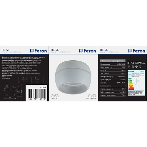 Характеристики Светильник потолочный Feron HL356 12W, 230V, GX53, белый