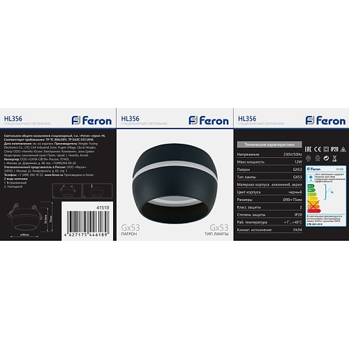 Характеристики Светильник потолочный Feron HL356 12W, 230V, GX53, черный