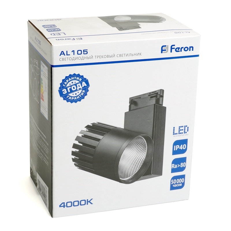 Характеристики Светодиодный светильник Feron AL105 трековый однофазный на шинопровод 30W 4000K, 35 градусов, черный серия MarketBright