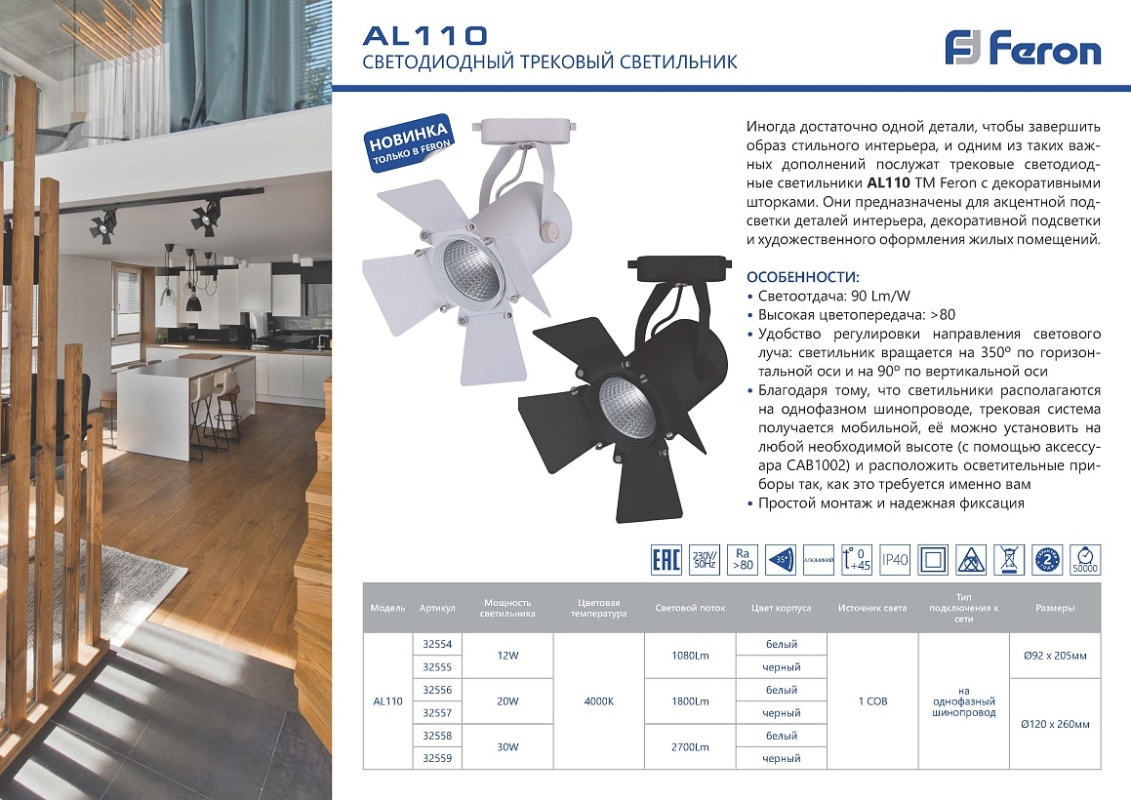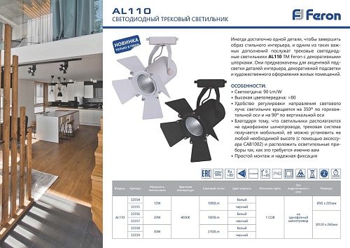 Характеристики Светодиодный светильник Feron AL110 трековый на шинопровод 30W 4000K 35 градусов белый