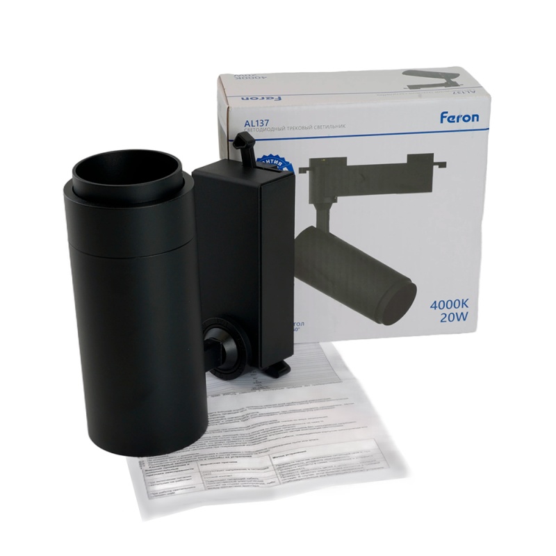 Характеристики Светодиодный светильник Feron AL137 трековый однофазный на шинопровод 20W 4000K черный, изменяемый угол освещения 15-60град