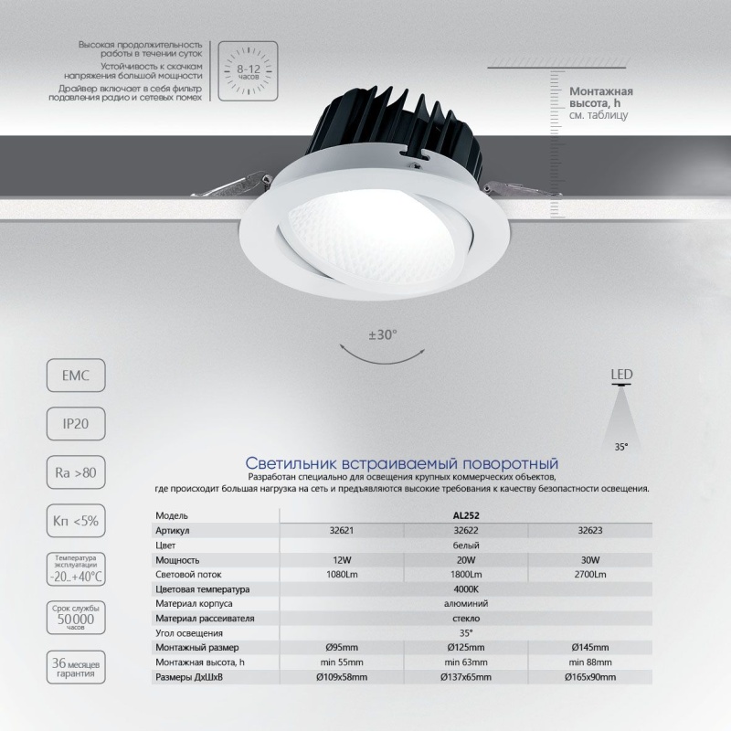 Характеристики Светодиодный светильник Feron AL252 встраиваемый 20W 4000K белый серия MarketBright