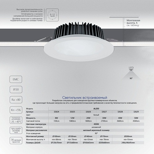 Характеристики Светодиодный светильник Feron AL253 встраиваемый 20W 4000K белый серия MarketBright