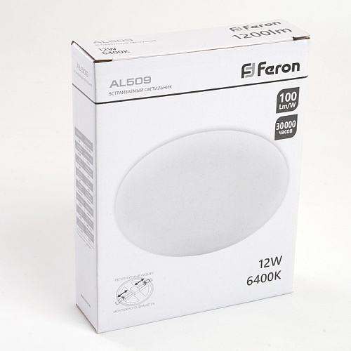 Характеристики Светодиодный светильник Feron AL509 встраиваемый с регулируемым монтажным диаметром (до 100мм) 12W 6400K белый серия FlexyRim