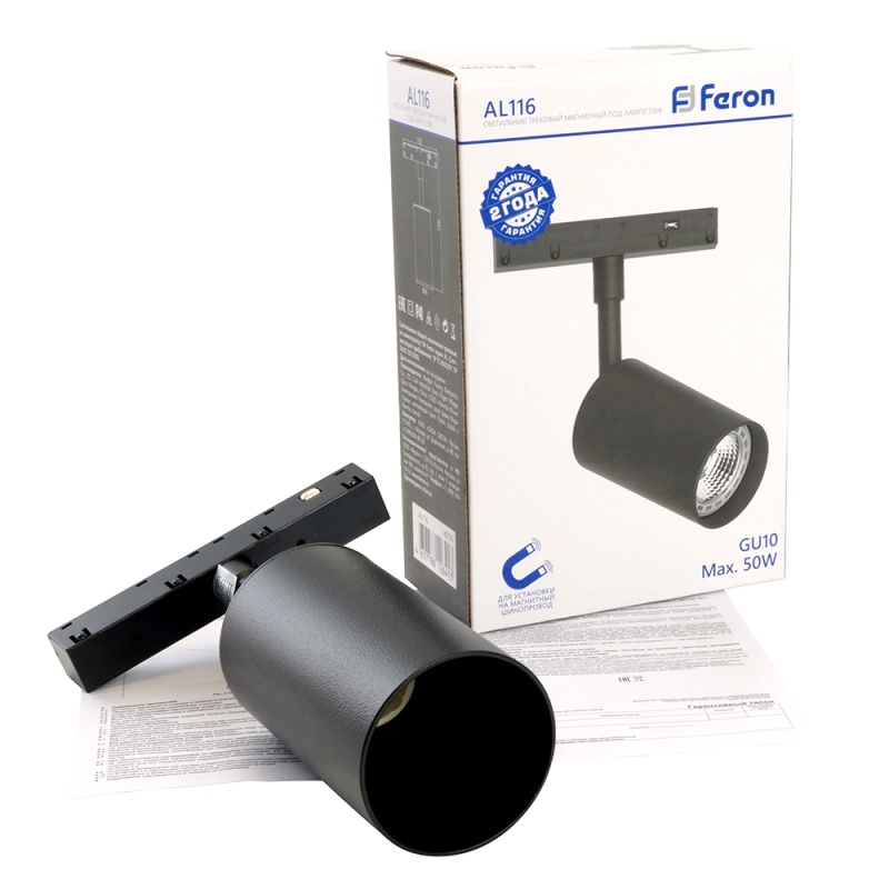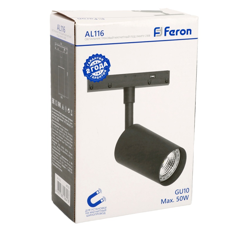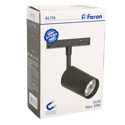 Характеристики Светильник Feron AL116 трековый магнитный под лампу GU10 230В, черный