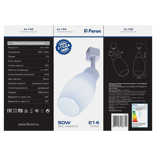 Характеристики Светильник Feron AL156 трековый однофазный на шинопровод под лампу E14, белый