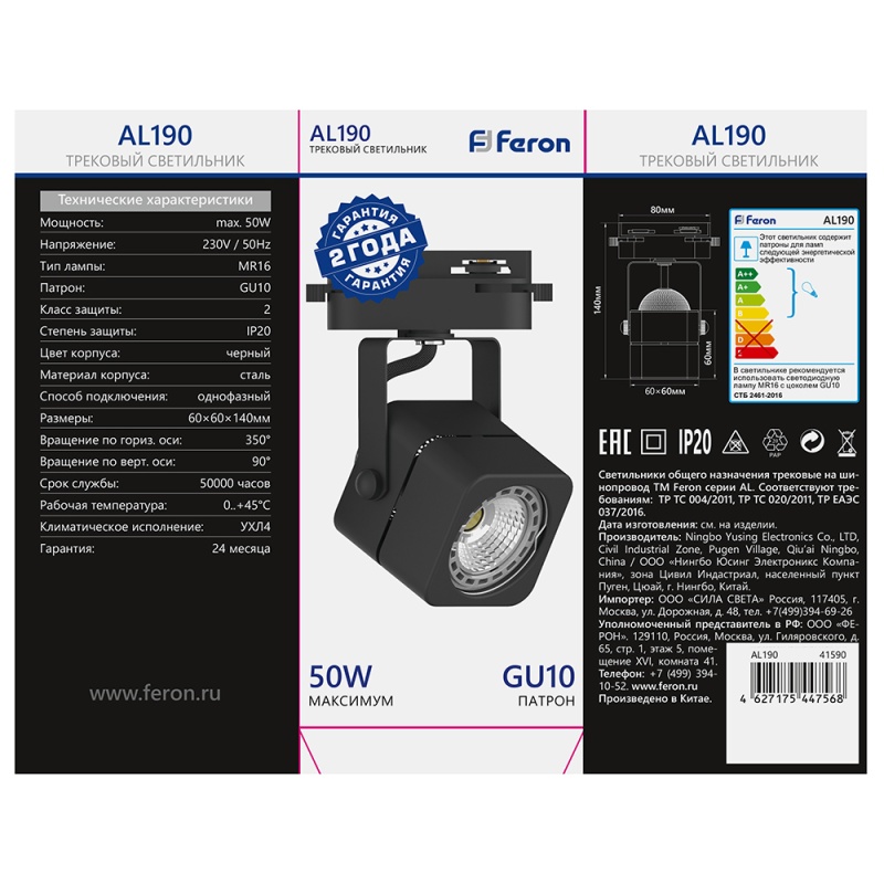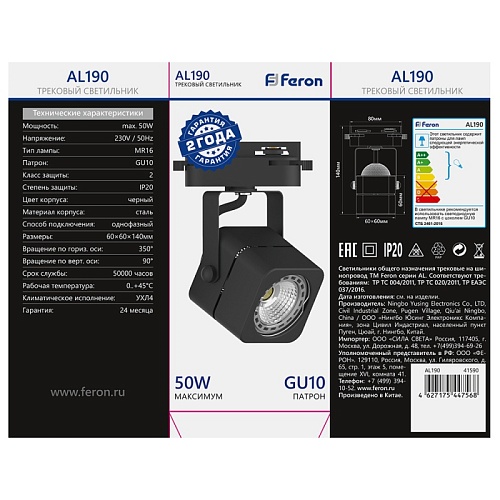 Характеристики Светильник Feron AL190 трековый однофазный на шинопровод под лампу GU10, черный