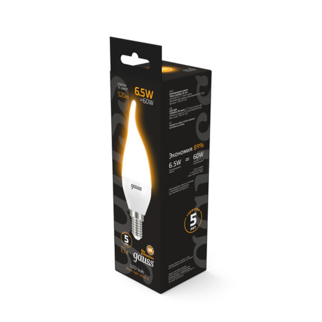 Характеристики Светодиодная лампа Gauss Свеча 6,5W 520Lm 3000K E14 104101107