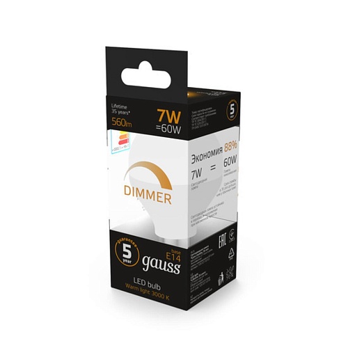 Характеристики Светодиодная лампа Gauss Шар 7W 560Lm 3000K E14 105101107-D