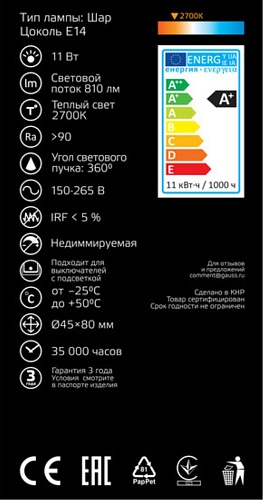 Характеристики Светодиодная филаментная лампа Gauss Шар 11W 720Lm 2700K E14 105801111