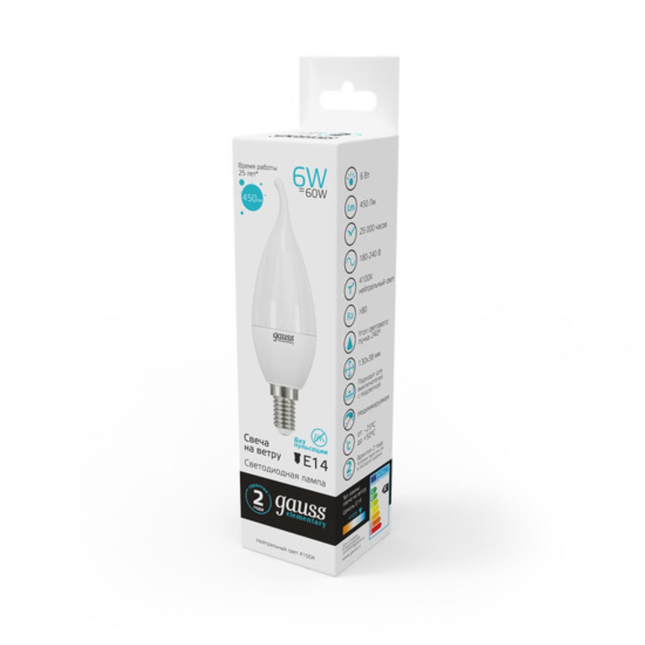 Характеристики Светодиодная лампа Gauss Свеча на ветру 6W 450Lm 4100K E14 34126