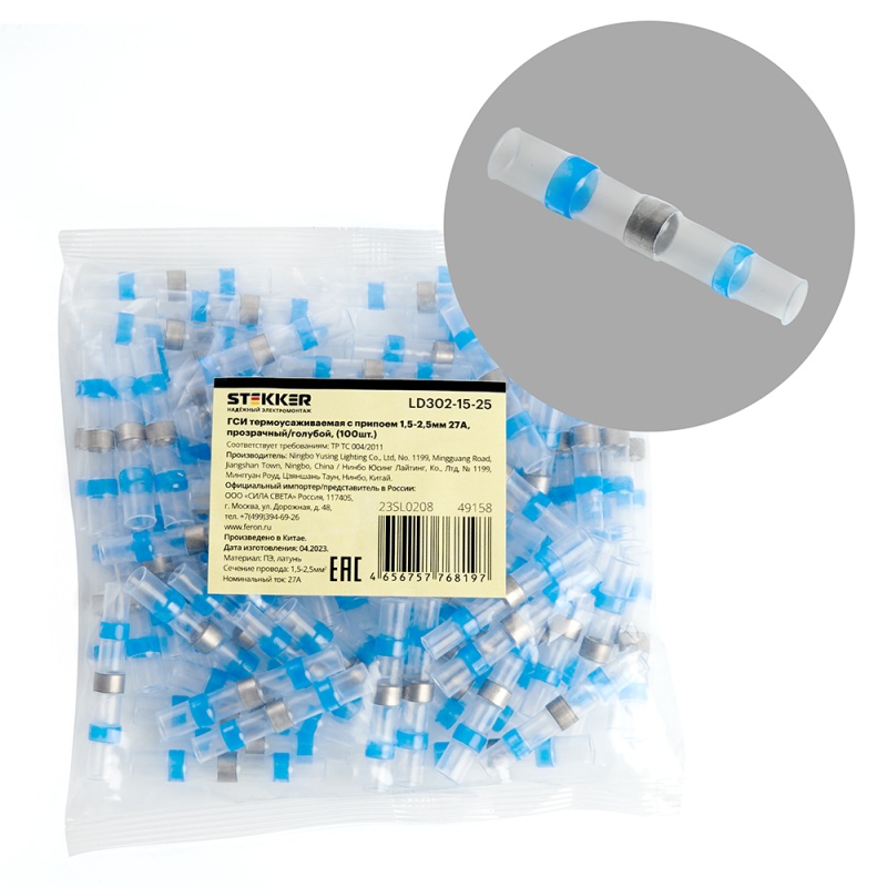 Характеристики LD302-15-25 ГСИ термоусаживаемая с припоем 1,5-2,5 мм2 27A, прозрачный/голубой