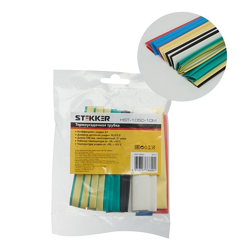 Характеристики Набор термоусадочных трубок STEKKER HSHT-1050-10M, длина 10 см., коэф. усадки 2:1, мультиколор (21шт в упаковке)