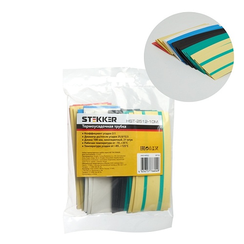 Характеристики Набор термоусадочных трубок STEKKER HSHT-2010-10M, длина 10 см., коэф. усадки 2:1, мультиколор (21шт в упаковке)