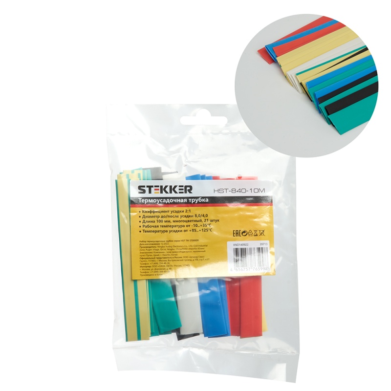 Характеристики Набор термоусадочных трубок STEKKER HSHT-840-10M, длина 10 см., коэф. усадки 2:1, мультиколор (21шт в упаковке)