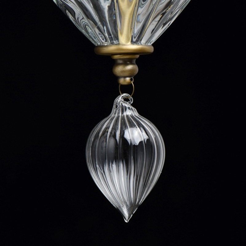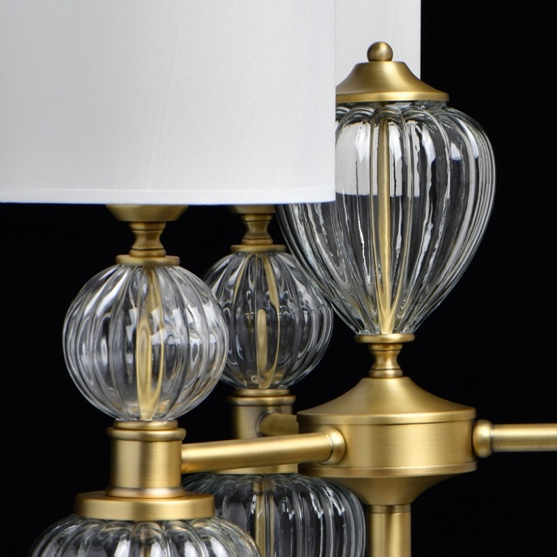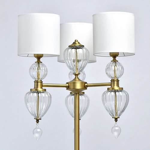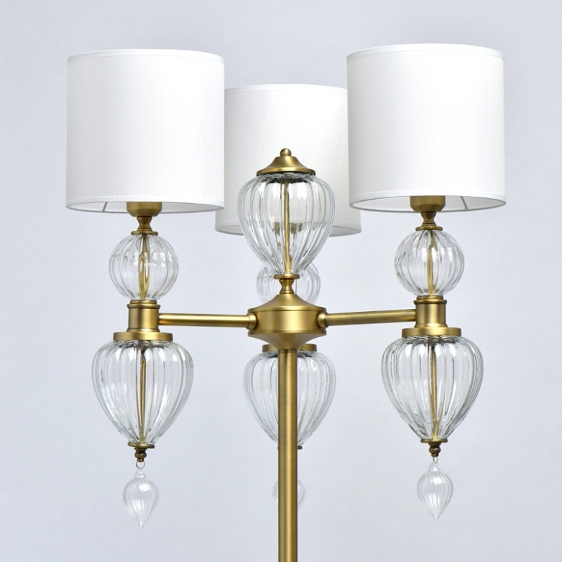 Основание светильника выполнено из металла и гальванизировано в цвет латуни. Светильник декорирован выдувным стеклом ручной работы. Текстильные абажуры белого цвета с термостойким акрилом внутри, отделаны кантом и прошиты.