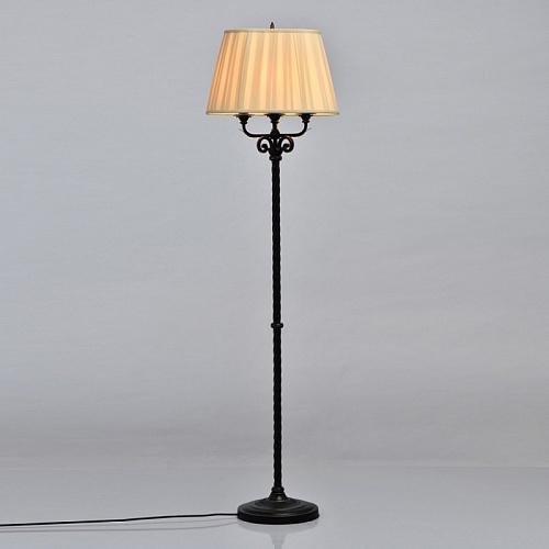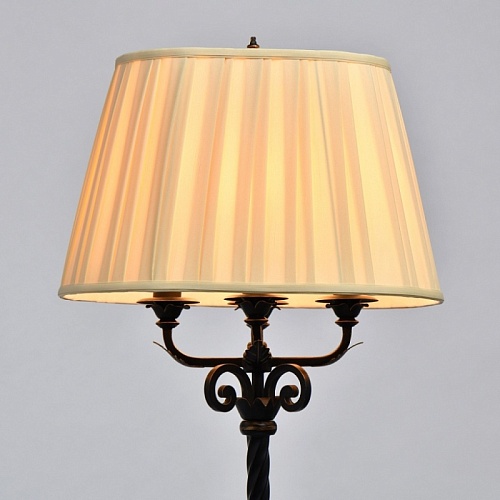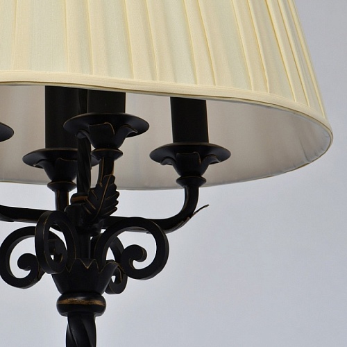 Основание светильника выполнено из металла по технологии художественной ковки и обработано по технологии хай-лайт, где основной слой черного цвета, а декоративный слой цвета бронзы. Текстильный абажур цвета слоновой кости.