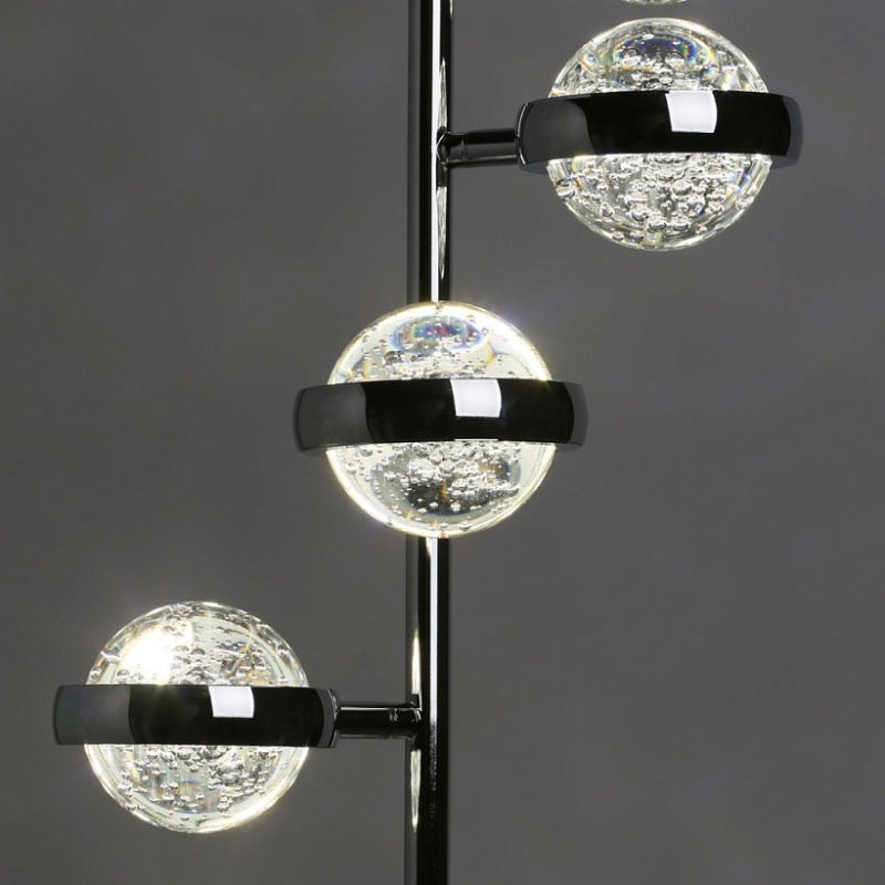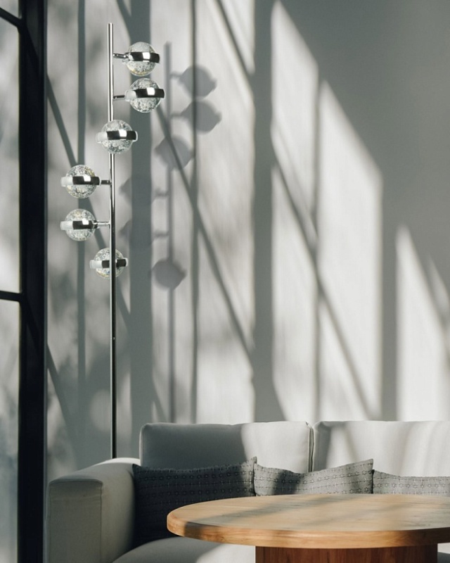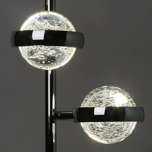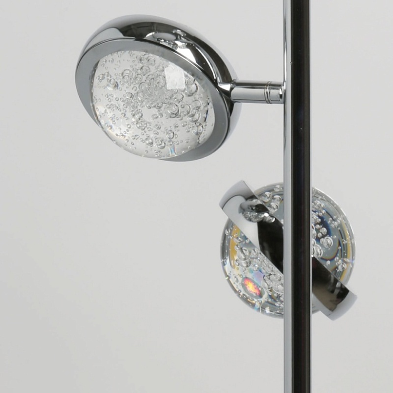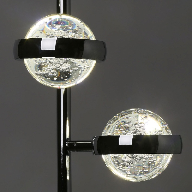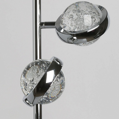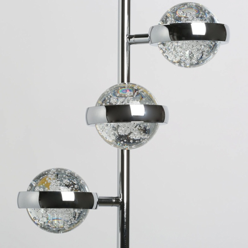 Основание светильника выполнено из сплава алюминия с цинком, обработано по технологии брашинга и гальванизировано в цвет хрома. Светодиодный источник света закрыт сферой из стекла с включениями пузырьков.