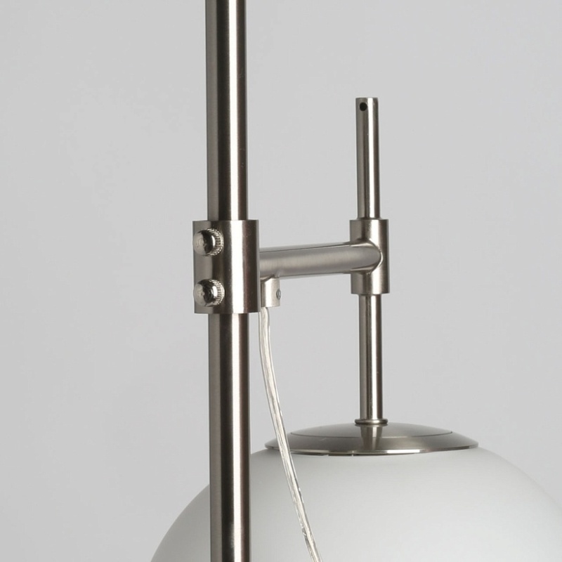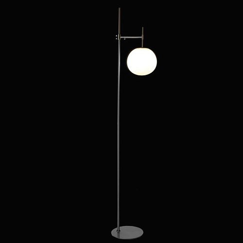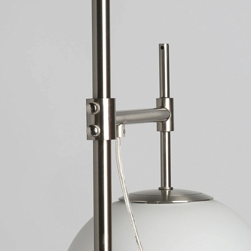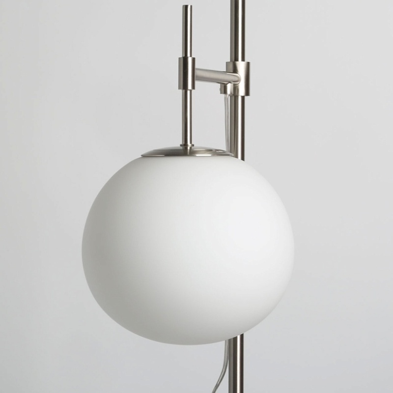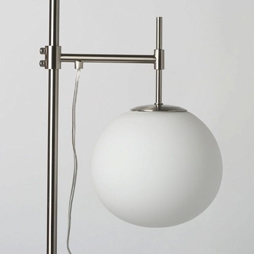 Металлическое основание напольного торшера гальванизировано в цвет никеля и матировано. Торшер декорирован округлым плафоном из белого матового стекла.