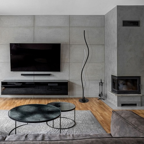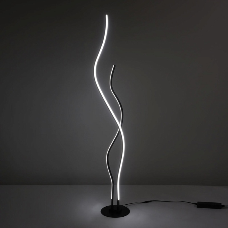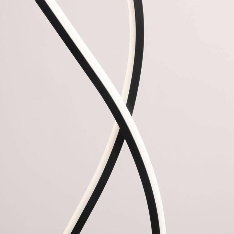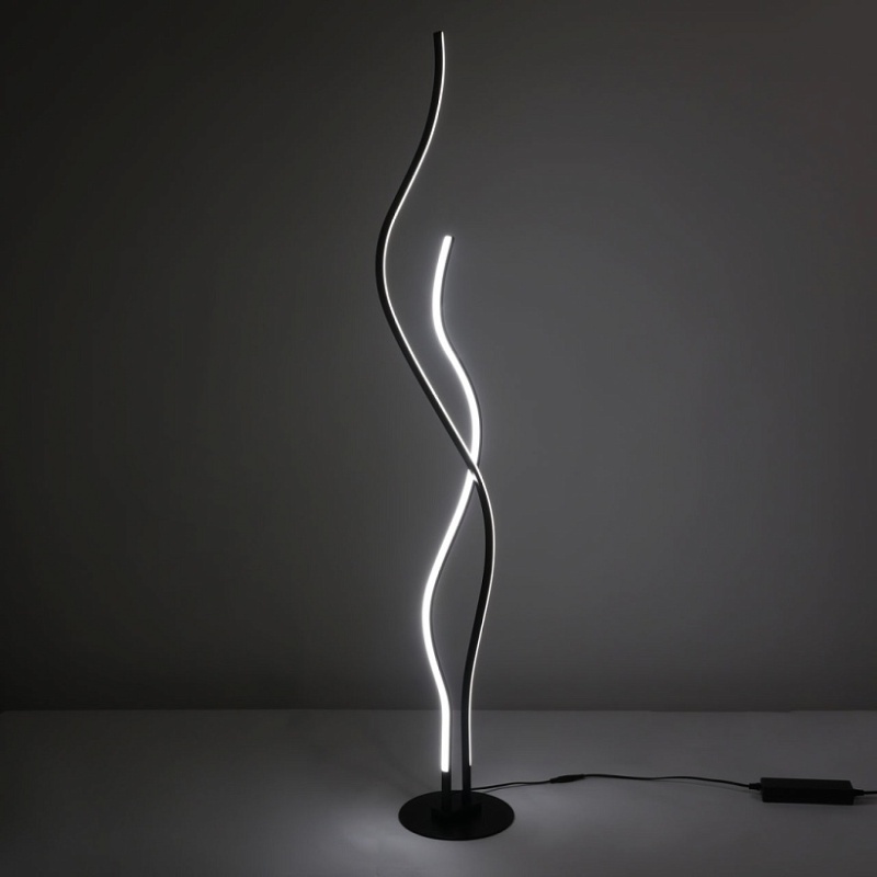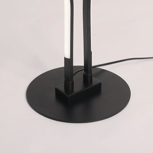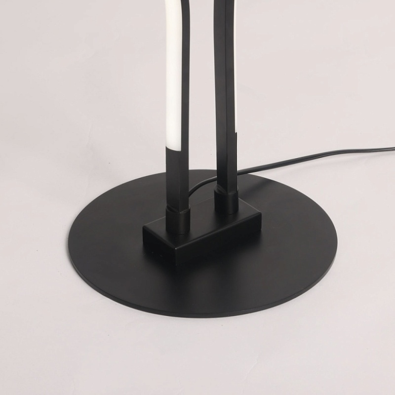 Металлическое основание торшера окрашено в черный цвет. Корпус плафонов выполнен из сплава алюминия с цинком и окрашен в цвет основания. Светодиодные источники света закрыты белым матовым акрилом.