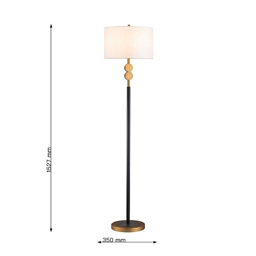 черный каркас с коричневым основанием, плафон из белой ткани, латунный декоративный элемент в виде двух кругов.