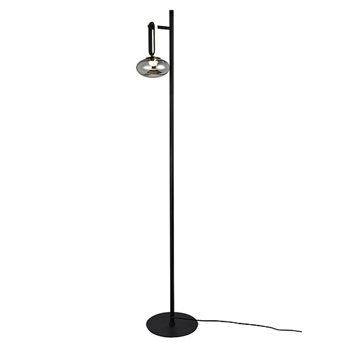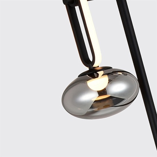 Металлический каркас в черном цвете с выдувным стеклянным плафоном, внутри расположен LED-модуль с закругленным акриловым рассеивателем, декоративный элемент с LED-лентой по внешнему периметру, выключатель на проводе.