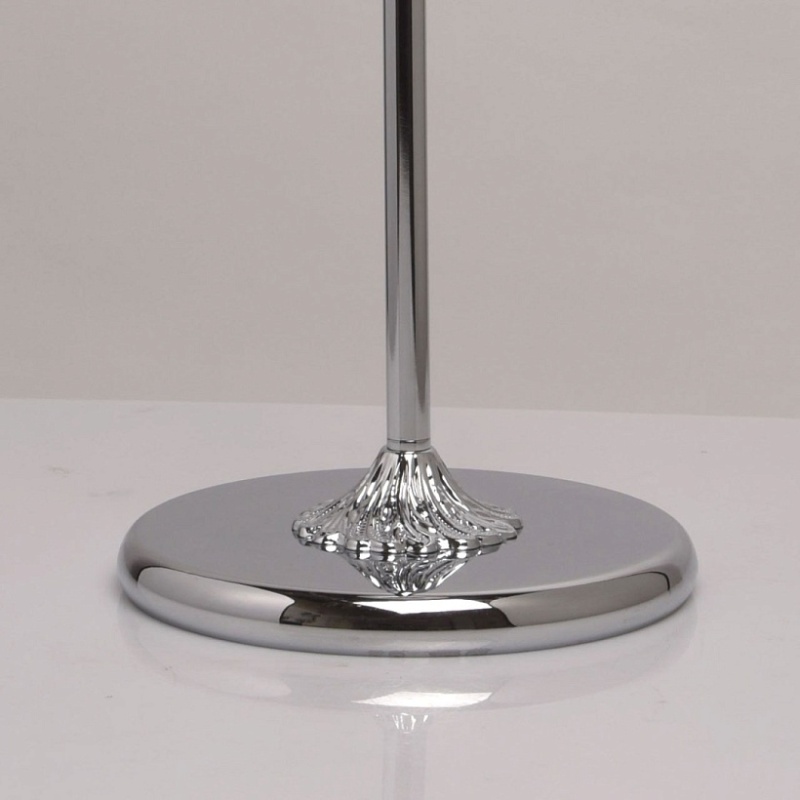 Основание: металл, гальванизировано в цвет хрома. Абажур: двухслойный текстильный абажур белого цвета с термостойким акрилом внутри. Декор: декоративная розетка из металла в цвет основания выполнена по технологии прессования.
