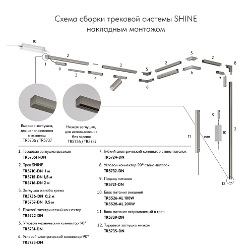 Характеристики TR5722-DN Электрический коннектор прямой для трека SHINE BASE, 48V DC, IP20, темный никель, алюминий