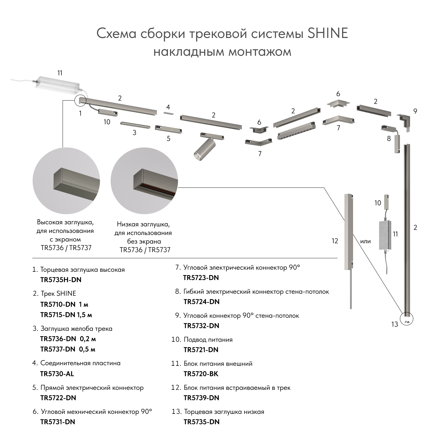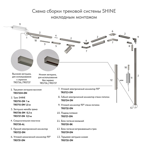 Характеристики TR5724-DN Электрический коннектор для трека SHINE BASE 90° стена-потолок с поворотом трека под произвольным углом, темный никель, алюминий