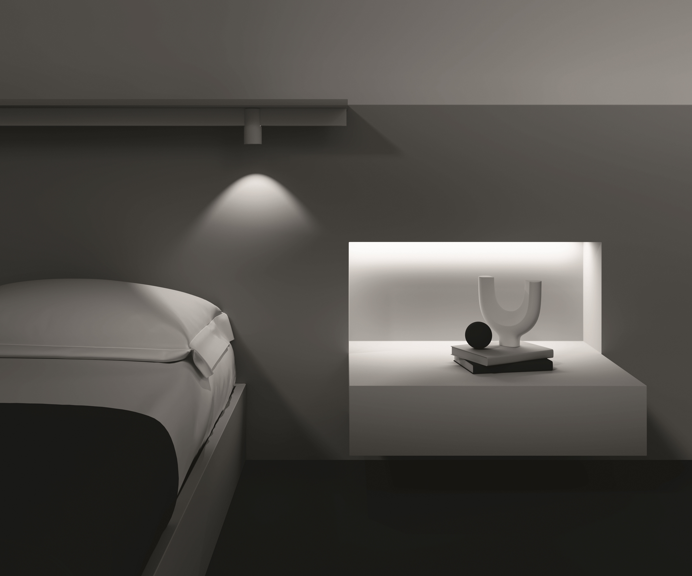 Алюминиевый корпус. Цвета - белый, черный и латунь с черным коннектором для установки в магнитный шинопровод Exility. LED-источник света. Два варианта цветовой температуры - 3000К и 4000К, а также умные светильники с регулировкой цветовой температуры от 3000 K до 6000 K и диммированием по протоколу Bluetooth Mesh. Источник света утоплен вглубь плафона для комфорта зрения. Корпус модели — форма вытянутого куба и цилиндра.