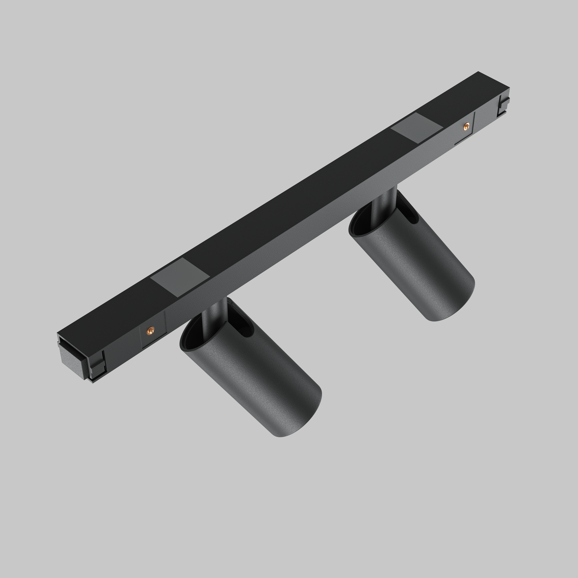 Черная арматура с глянцевой поверхностью выполнена из алюминия. Плафоны могут вращаться независимо друг от друга, обеспечивая точечное освещение зон. Две модели — в спотовом или подвесном исполнении. LED-источники поддерживают переменную цветовую температуру в диапазоне от 3000К до 6000К. При использовании стандартных блоков питания без функции управления, светильники при установке в трек одной стороной имеют цветовую температуру 3000K, а при установке другой стороной – 6000К. Светильники поддерживают функцию группового диммирования и регулировки цветовой температуры при использовании блоков питания по протоколам Bluetooth Mesh или DALI.