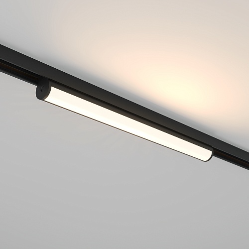Линейный трековый светильник с корпусом из экструдированного алюминия в стильном чёрном цвете. Рассеиватель из матового поликарбоната обеспечивает равномерный свет и визуальный комфорт. Достаточная мощность светильника позволяет использовать модель в качестве основного освещения. При использовании стандартных блоков питания без функции управления, светильники при установке в трек одной стороной имеют цветовую температуру 3000K, а при установке другой стороной – 6000К. Светильники поддерживают функцию группового диммирования и регулировки цветовой температуры при использовании блоков питания по протоколам Bluetooth Mesh или DALI. Светильники данной серии совместимы с трековой системой Basity.