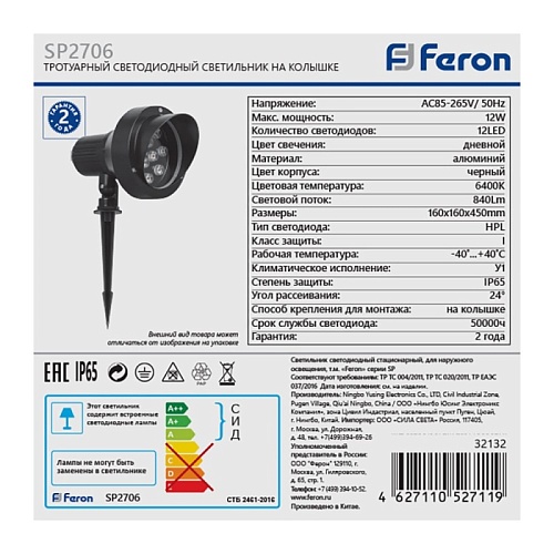 Характеристики Светодиодный светильник тротуарный (грунтовый) Feron SP2706 12W 6400К 85-265V IP65