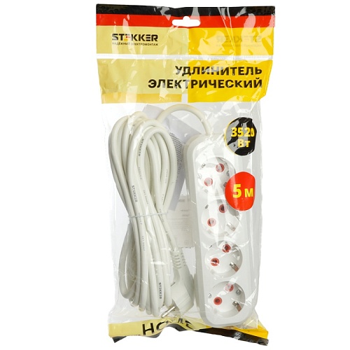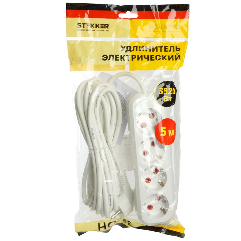 Удлинитель четырехместный c/з STEKKER HM06-40-05 3x1мм2, 5м, серия Home (У10-429), белый 49352