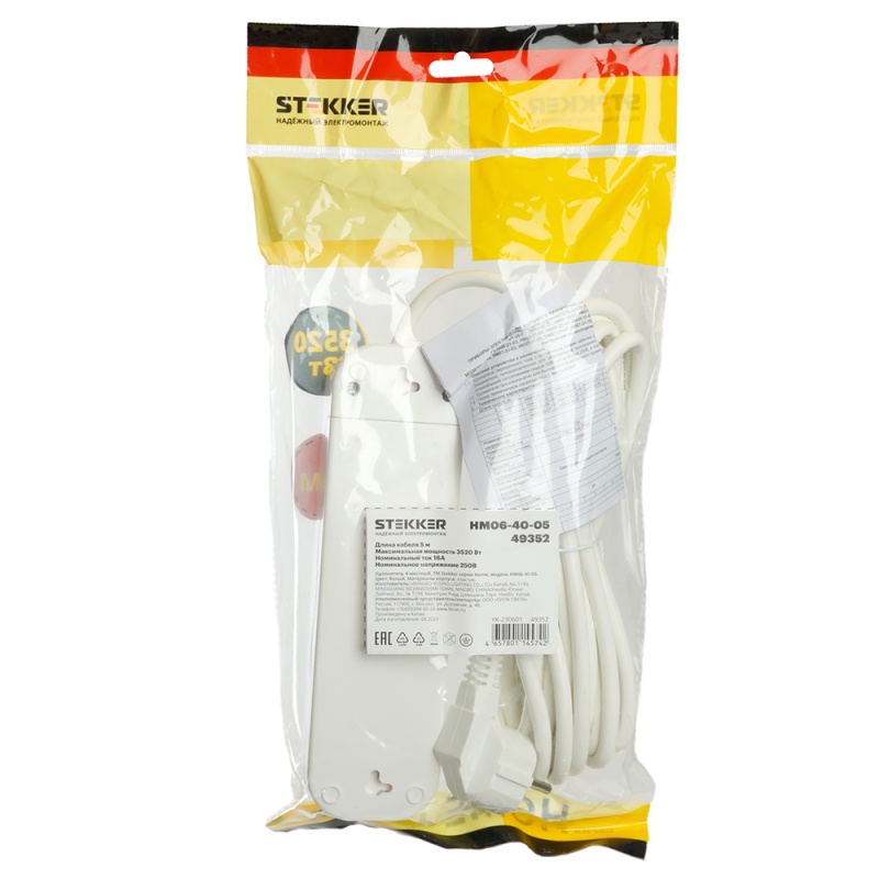 Характеристики Удлинитель четырехместный c/з STEKKER HM06-40-05 3x1мм2, 5м, серия Home (У10-429), белый