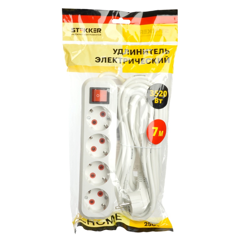 Отзывы о Удлинитель четырехместный с/з с выключ. STEKKER HM07-41-07 3x1мм2, 7м, серия Home (У16А-003), белый