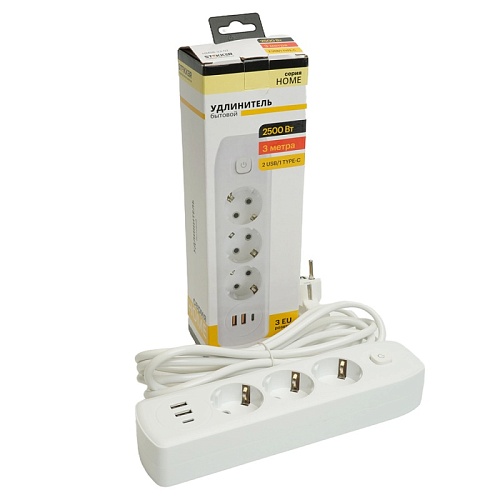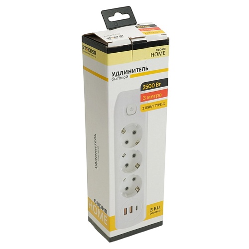 Удлинитель 3-местный c/з 3x1 мм2, 3 м, 250В, 10А, 2USB+1Type-C 2,4А, серия Home plus, белый STEKKER HM08-33-02