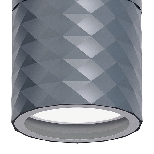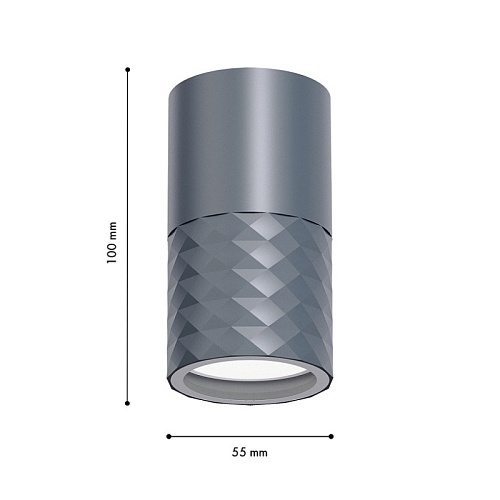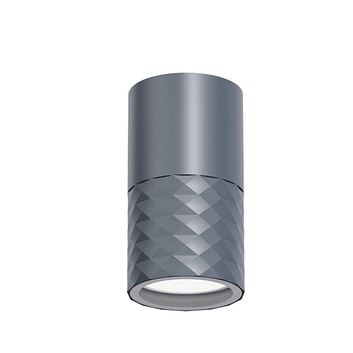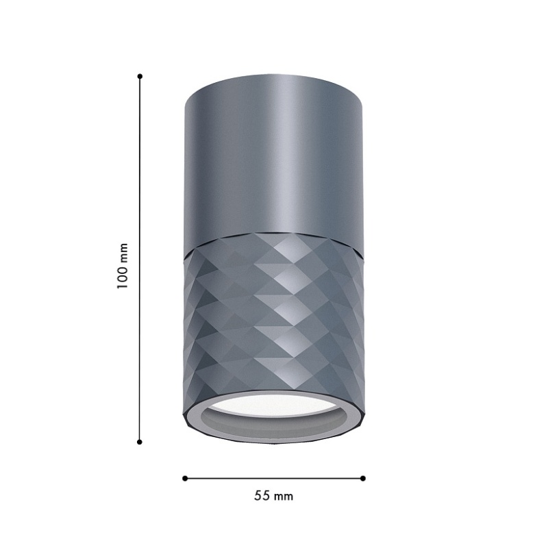 Корпус из металла серого цвета, состоящий из гладкой и ребристой частей, сменные лампы GU10.