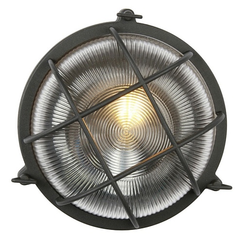 Металлический каркас черного цвета, плафон из закаленного прозрачного стекла, сменная лампа, цоколь E27, IP54.