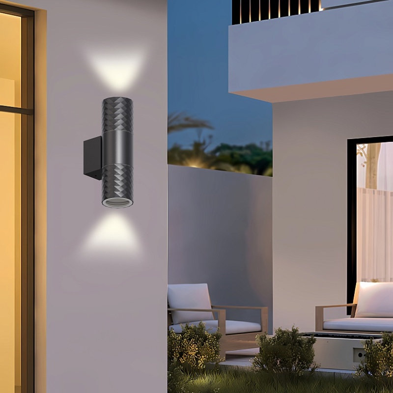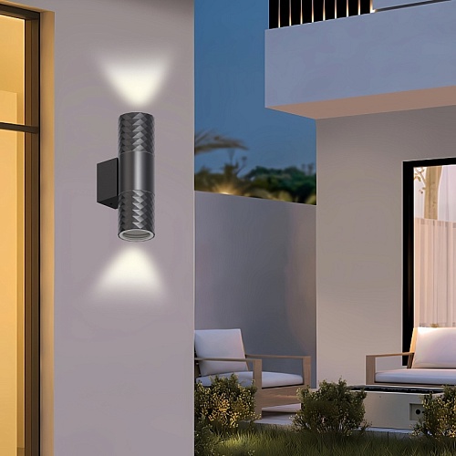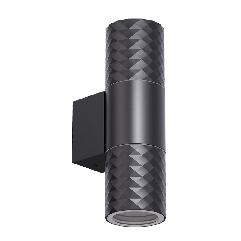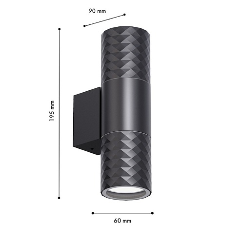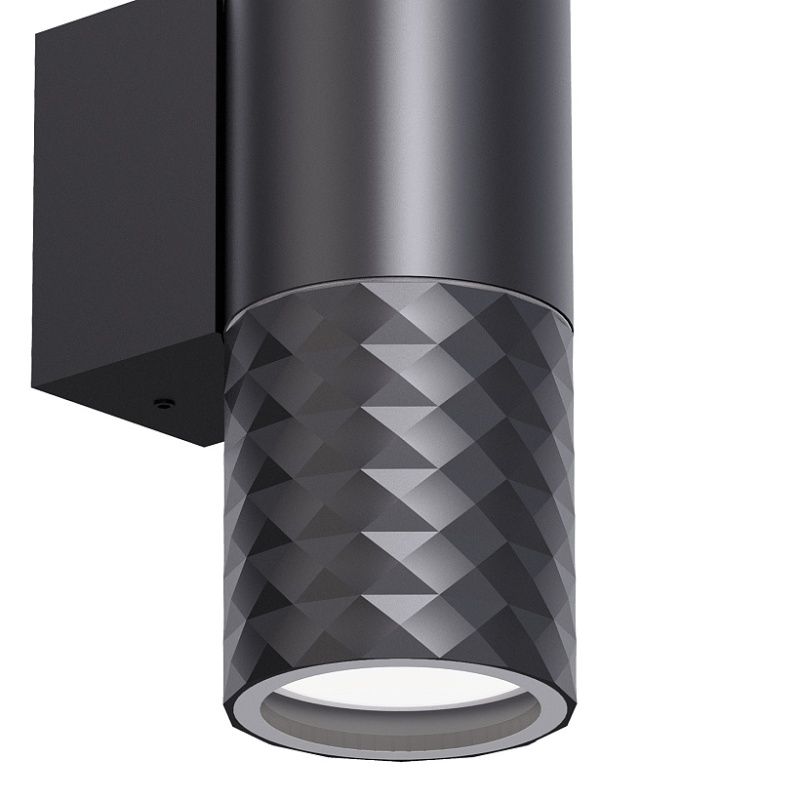 Корпус из металла черного цвета, состоящий из гладкой и двух ребристых частей, сменные лампы GU10.