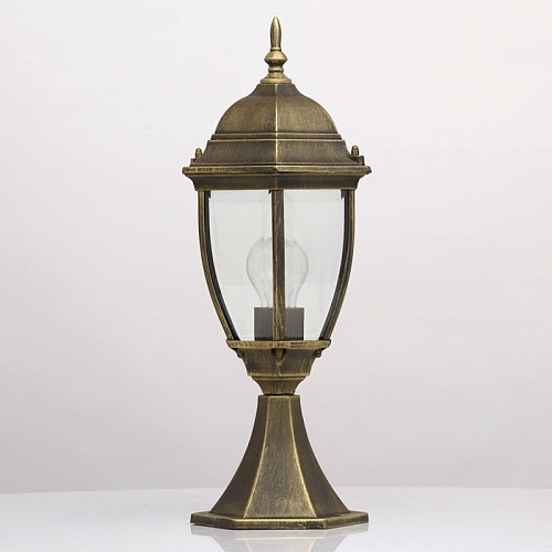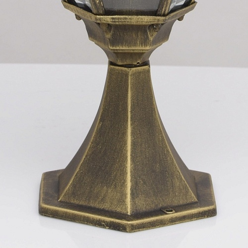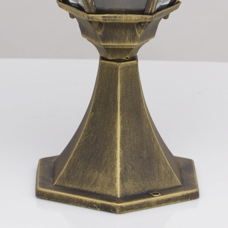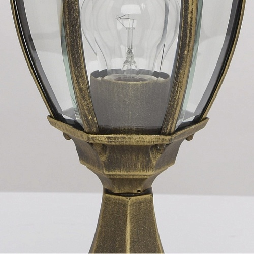 Корпус светильника выполнен из сплава алюминия с цинком и окрашен по технологии порошкового окрашивания в черный цвет с патинированием в цвет старинной позолоты. Плафон составляют одинакового размера пластины стекла, изогнутые по форме.
