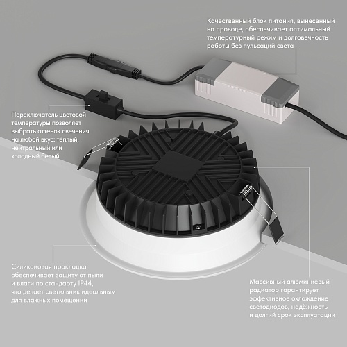 Светильники TRIM — лаконичный дизайн и надёжный свет для современных интерьеров. Серия представлена тремя моделями мощностью 12, 18 и 24 Вт и идеально подходит как для жилых, так и для коммерческих помещений. Корпус с тонкой рамкой гармонично вписывается в любой интерьер, а утопленный рассеиватель обеспечивает мягкое, комфортное освещение без эффекта ослепления. Высококачественные светодиоды Epistar (CRI ? 90) и драйвер Eaglerise обеспечивают стабильную работу и естественную цветопередачу. Каждый светильник предлагает выбор из трёх цветовых температур: 3000K, 4000K и 6500K — переключатель расположен прямо на кабеле, что делает настройку максимально удобной. Выносной блок питания работает в оптимальном температурном режиме, продлевая срок службы всей системы, а алюминиевый радиатор эффективно отводит тепло. Светильники защищены от влаги по стандарту IP44, благодаря чему подходят для ванных комнат, кухонь, коридоров и других помещений с повышенной влажностью. TRIM обеспечивает яркость, которую невозможно достичь с обычными моделями на сменных лампах. TRIM — это свет, который работает на ваш стиль и комфорт. Срок гарантии 3 года.