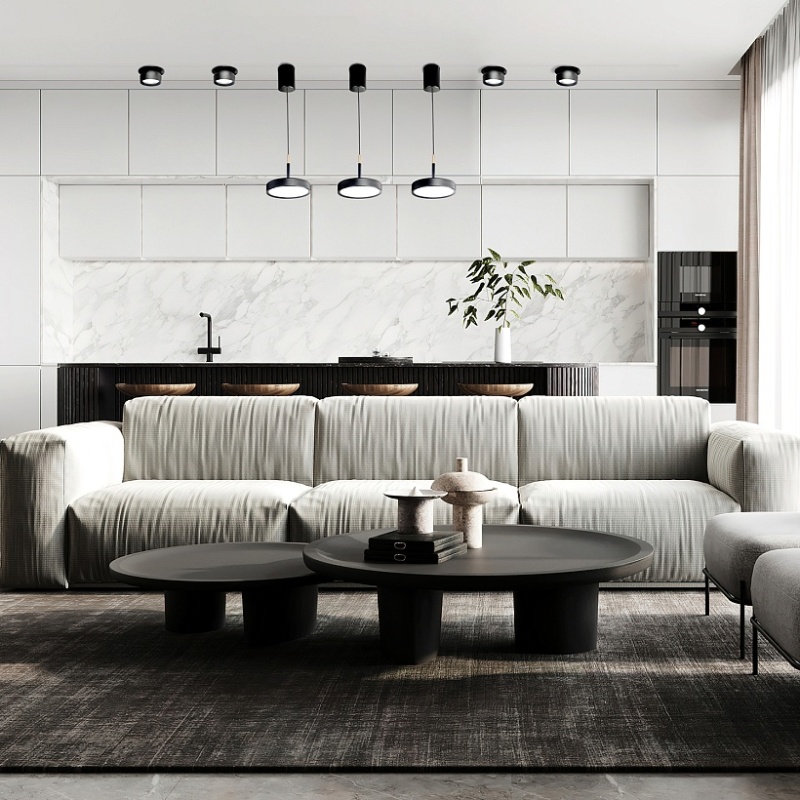 Каркас полусферической формы белого матового цвета, поворотный плафон со встроенным модулем LED, смещен вглубь плафона для создания более направленного потока света.