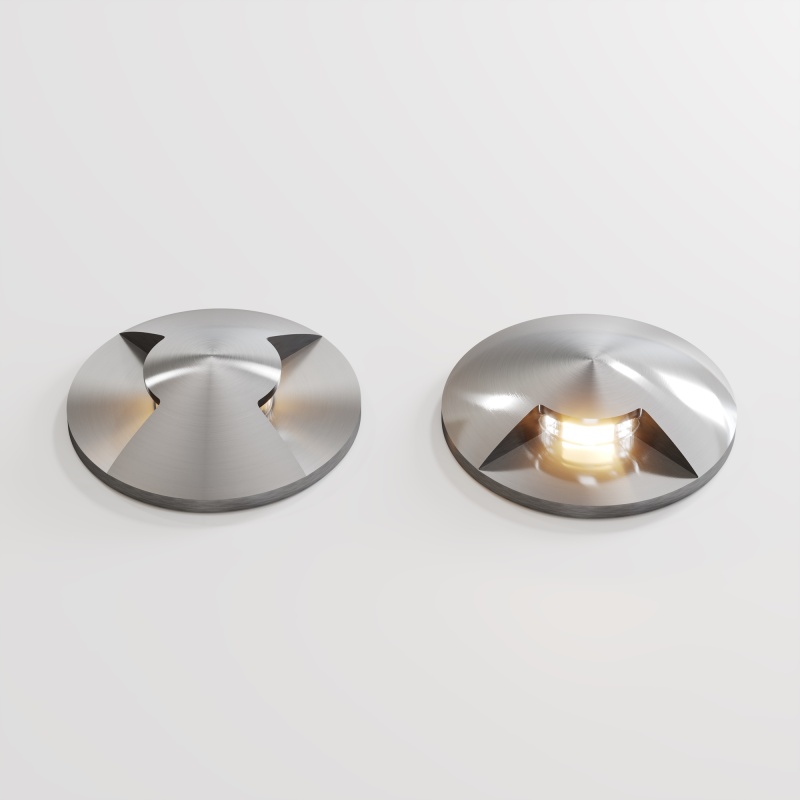 Металлический корпус из нержавеющей стали. Цвет - серебристый. Три дизайна корпуса - три варианта свечения. Высокая степень защиты IP67 позволяет использовать во влажных зонах. Подходят для маркерной подсветки дорожек и лестниц.